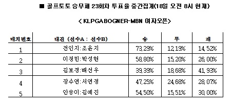 또, 골프팬들은 2번 매치의 이정민(58.80%)이 26.00%를 기록한 박성현보다 좋은 성적을 거둘 것으로 예상했고, 3번 매치의 김보경과 배선우가 각각 39.39%와 41.93%를 기록하며 팽팽한 접전을 펼칠 것으로 전망했다. 4, 5번 매치에서는 장수연(47.25%)과 안송이(54.50%)가 각각 서연정(28.07%), 김예진(30.00%) 선수를 누를 것으로 나타났다.