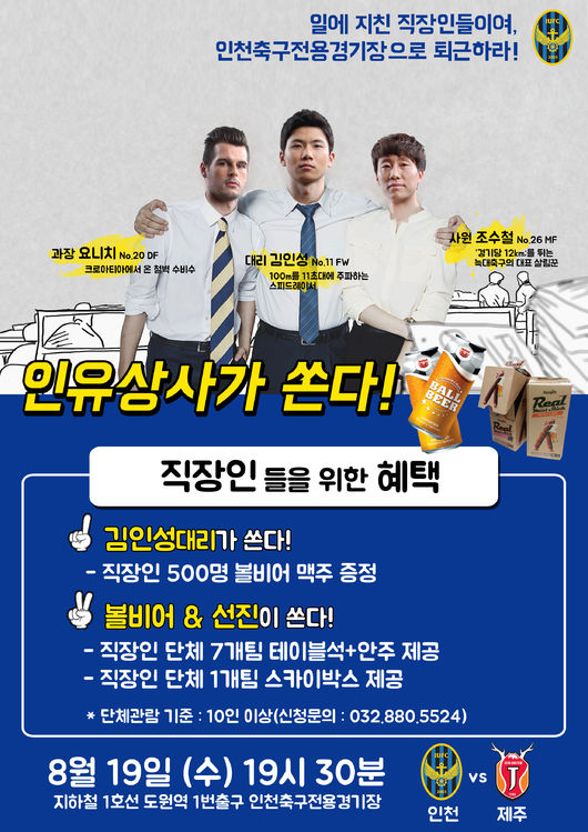 인천은 지난 경기에 이어 이번에도 평일 경기 컨셉에 맞춰 ‘직장인 건전한 회식문화 만들기’를 이어나갈 예정이다.