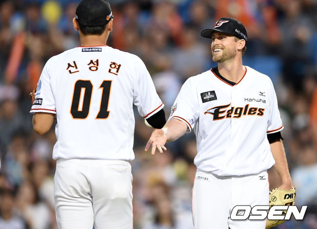 3회초 2사 2루에서 한화 탈보트가 NC 나성범을 플라이로 처리하고 미소짓고 있다.