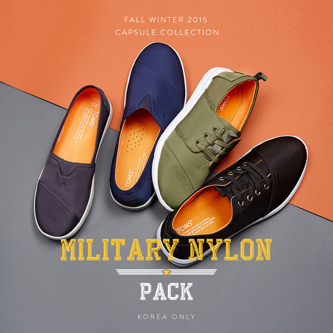 소비자가 하나를 구입할 때마다 도움이 필요한 한 사람을 돕는 One for One 기부를 실천하는 탐스 TOMS가 2015년 가을 캡슐 컬렉션으로 한국 한정판 '밀리터리 나일론 팩'을 20일 출시한다.