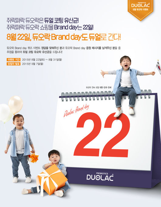 '듀오락 브랜드 데이' 이벤트는 누구나 쉽게 참여 가능한 '빈칸 채우기 퀴즈 이벤트'와 '듀오락 브랜드 데이 응원 메시지 이벤트'로 구성되어 있다. 퀴즈 정답자와 응원 메시지 작성자 중 추첨을 통해 각각 20명에게 '듀오락 지사랑' 1개월분을 증정한다. 이벤트는 모두 듀오락몰(www.duolac.co.kr)에서 진행된다.