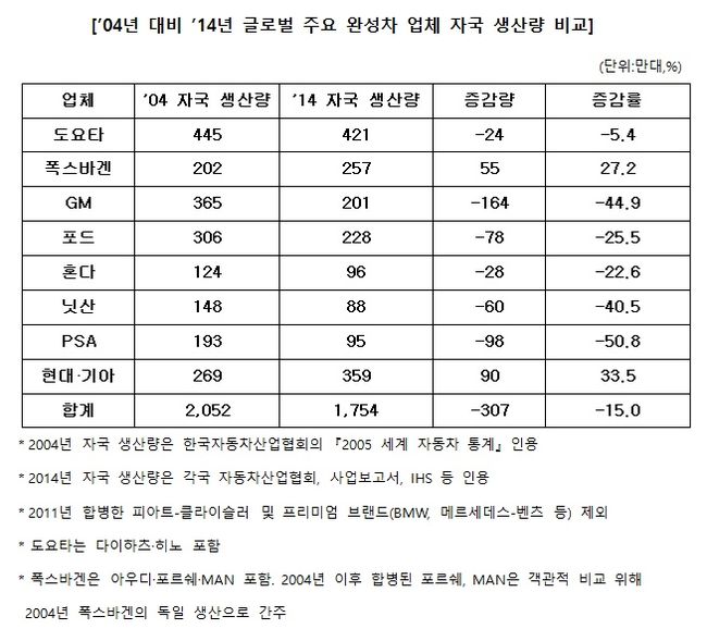 현대•기아차와 폭스바겐을 제외한 나머지 업체들의 자국 생산량은 지난 10년 사이 일제히 줄었다.