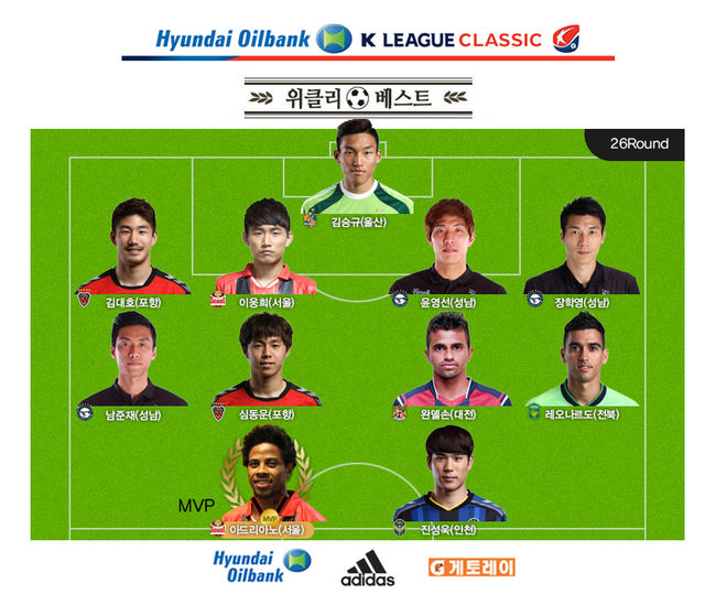 프로축구연맹은 21일 지난 19일에 열린 K리그 클래식 26라운드 MVP와 베스트 11, 베스트 팀, 베스트 매치 등을 발표했다.