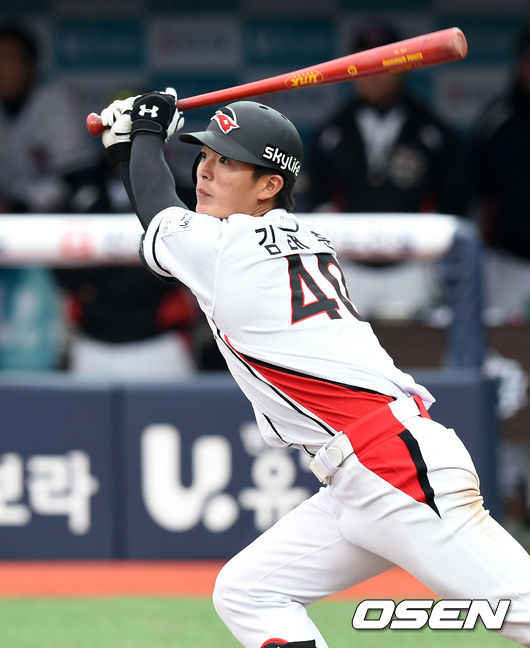 1군 등록과 함께 7번 지명타자로 선발출장한 김태훈은 3회 첫 타석에서 유격수 땅볼 아웃됐지만 5회 두 번째 타석에서 안영명을 상대로 홈런을 뽑아냈다. 안영명의 초구 가운데 높은 137km 직구를 힘껏 받아쳤다. 비거리 125m 중월 솔로 홈런. 대전구장의 가장 먼 곳을 넘기는 프로 데뷔 첫 홈런으로 강한 인상을 남겼다. /waw@osen.co.kr