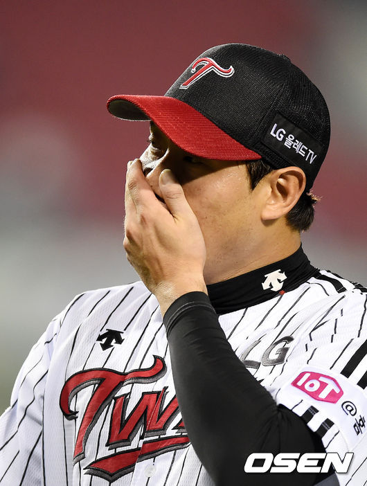 5회초 2사 1루에서 LG 류제국이 두산 김현수의 투수앞 강습 타구를 처리하며 안도의 한숨을 쉬고 있다.