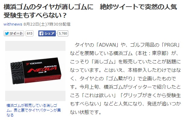 원래 수험생을 겨냥한 제품은 아니었지만, '미끄러지지 않는 지우개'라는 입소문이 돌면서 수험생들은 부적을 하나씩 갖고 있는다는 마음으로 지우개를 구입하기 시작했다. 일본 내에서는 '여자가 봐도 근사하다', '내가 쓰고 있는 타이어도 지우개로 쓸 수 있는가', '손에 착 감기고 잘 지워진다', '우리 아들 수험때 하나 살까' 등의 반응을 내놓고 있다./ OSEN
