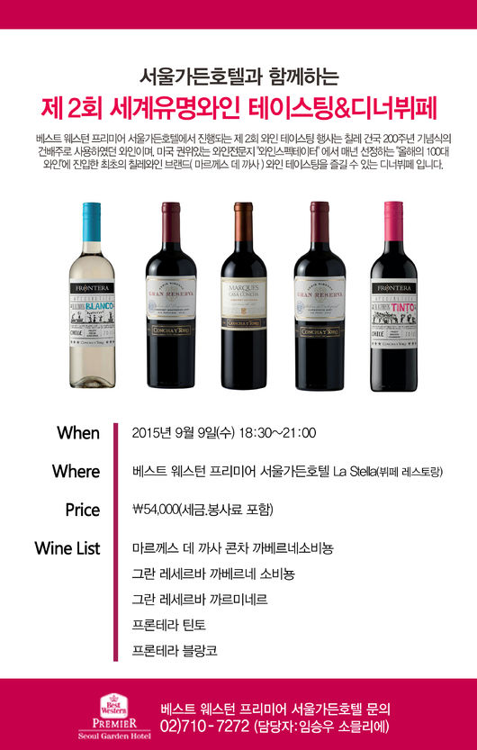 이번 선보이는 제 2회 세계유명와인 테이스팅&디너뷔페 5종의 칠레 와인을 취급하는 공식 수입사는 금양 인터네셔널로 마르께스 데 콘차 까베르네 소비뇽(Marques de Casa Concha Cabernet Sauvignon), 그란 리세르바 까베르네 소비뇽(Gran Reserva Cabernet Sauvignon), 그란 리세르바 까르미네르(Gran Reserva Carmenere), 프론테라 틴토(Frontera Tinto), 프론테라 블랑코(Frontera Blanco) 5가지다.