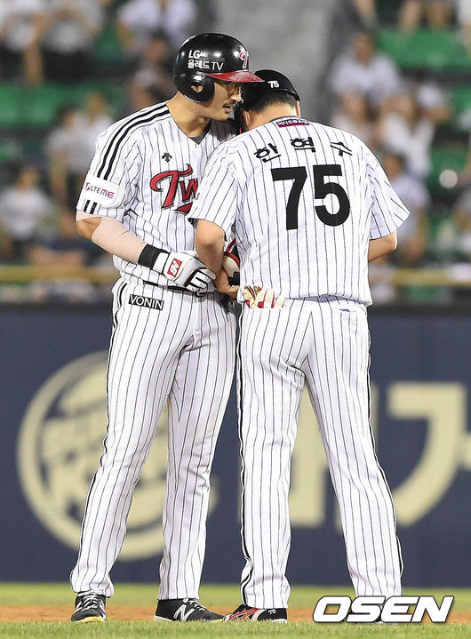 23일 오후 서울 잠실구장에서 열린 '2015 타이어뱅크 KBO 리그' LG 트윈스와 넥센 히어로즈의 경기 6회말 1사 1루 박용택이 1타점 2루타를 치고 한혁수 코치와 이야기를 나누고 있다.