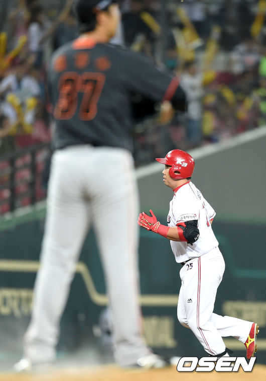 7회말 무사에서 KIA 이범호가 좌중월 솔로 홈런을 치고 그라운드를 달리고 있다.