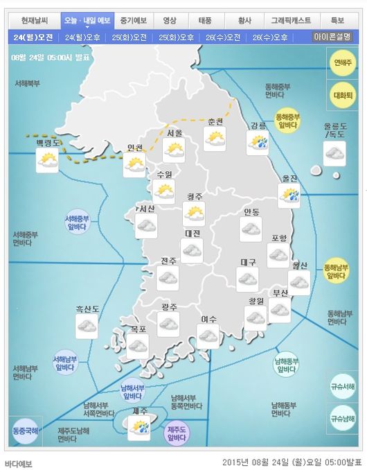 8월 24일 오전 현재 강원도영동을 제외한 중부지방은 대체로 맑고, 강원도영동과 남부지방은 대체로 흐린 날씨를 보이고 있다.
