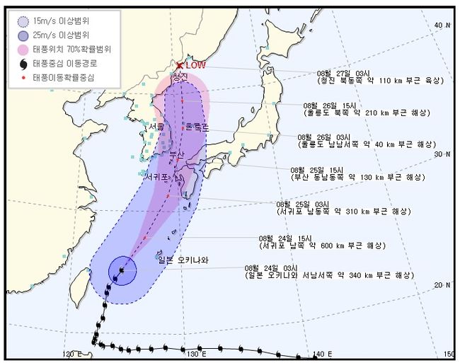 강원도영동, 경상남북도(경상남도는 25일까지), 제주도(25일까지), 울릉도.독도, 북한은 100~200mm의 강한 비가 예상 된다.