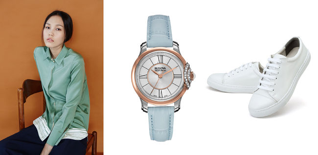 편안한 착용감과 심플한 디자인으로 어디에나 매치할 수 있는 스니커즈의 인기가 높아지면서 하이힐로 대표되던 오피스 룩도 트렌드에 맞춰 변화하고 있다. 다만 클래식한 오피스 룩과 캐주얼한 스니커즈를 믹스 매치하는게 어색하다면 캐주얼한 셔츠와 액세서리로 상의에 집중해 볼 것. 실크 소재 특유의 광택과 부드러운 느낌의 민트 색상이 어우러진 블라우스는 여성스러운 분위기를 연출하는데 알맞은 아이템이다. 컬러 매치를 완성시켜줄 하늘색의 가죽 손목 시계는 골드 케이스와 실버 비즈가 우아한 매력을 더해준다. 옷과 액세서리로 컬러 포인트를 살렸다면 코디의 균형을 위해 깔끔하고 심플한 화이트 스니커즈와 무채색의 슬렉스를 매치하면 더욱 센스 있는 스타일을 완성할 수 있다.