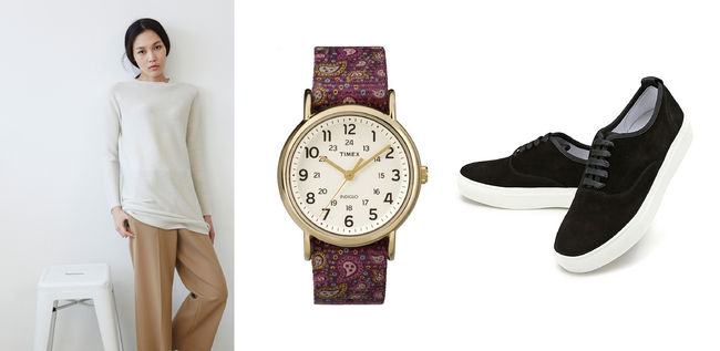여유로운 휴일을 보내거나 연인과의 데이트를 계획하고 있다면 놈코어 룩을 추천한다. 지난 시즌부터 열풍이 이어지고 있는 놈코어 룩은 패션에 관심 없는 여성들도 센스 있는 아이템만 추가하면 손쉽게 연출 할 수 있는 스타일이다. 부드러운 촉감의 화이트 니트 톱과 브라운 컬러의 와이드 팬츠를 매치하면 편안하면서도 트렌드에 어울리는 놈코어 룩을 연출할 수 있다. 여기에 와인 컬러의 페이즐리 패턴이 매력적인 손목 시계와 깔끔하고 심플한 디자인으로 계절에 관계 없이 인기 있는 스니커즈는 스웨이드 가죽 소재를 선택하면 가을 분위기 연출에 도움이 된다.
