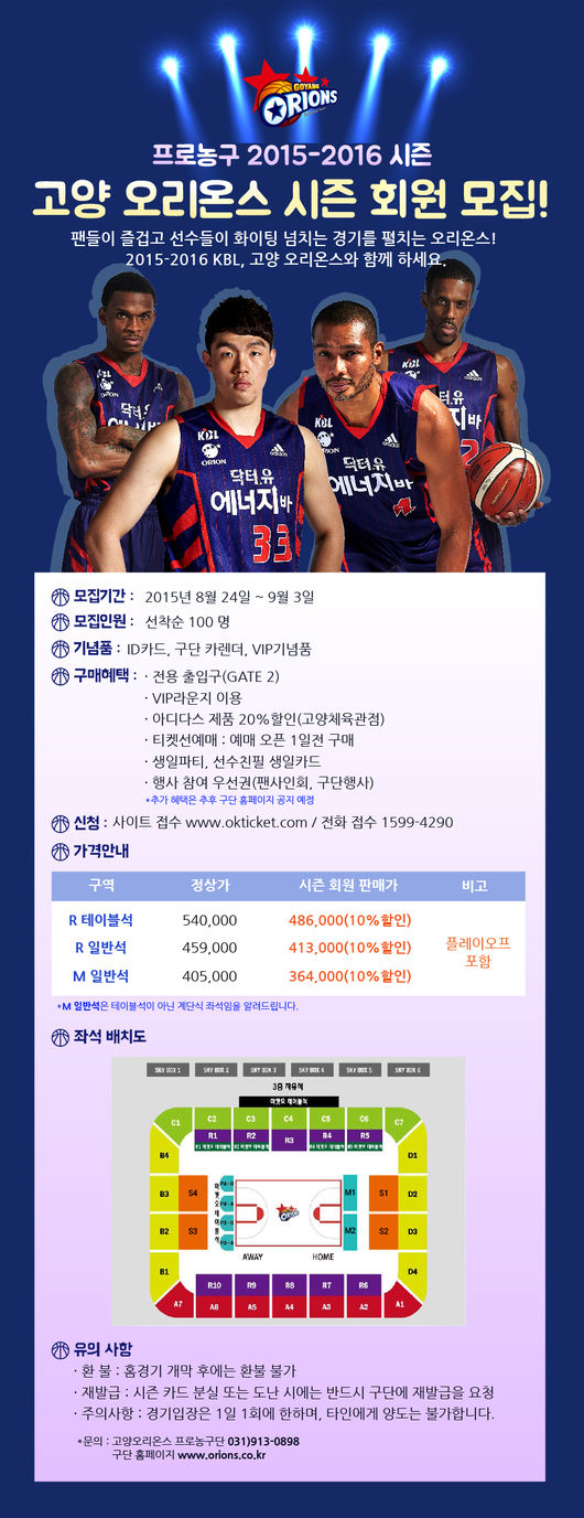 고양 오리온스가 24일부터 인터넷과 전화접수를 통해 2015-2016 시즌권을 판매한다. 오리온스의 홈경기장 고양체육관에서 열리는 정규리그(27경기)와 플레이오프(진출 시) 전 경기를 관람할 수 있는 이번 시즌권은 1층 일반석과 테이블석 총 3가지 상품으로 구성되어 있다.