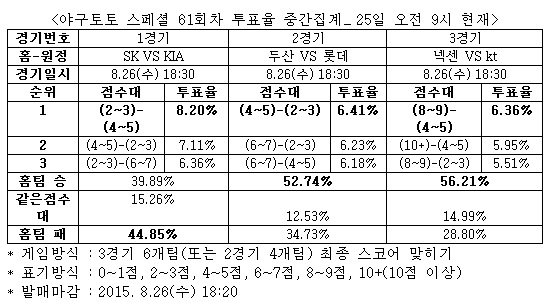 [야구토토] 국민체육진흥공단(www.kspo.or.kr)이 발행하는 체육진흥투표권 스포츠토토(www.sportstoto.co.kr)는 26일에 열리는 2015시즌 한국프로야구(KBO) 3경기를 대상으로 한 야구토토 스페셜 61회차 투표율을 중간 집계한 결과, 참가자들은 1경기 SK-KIA전에서 KIA의 우세를 예상했다고 밝혔다.