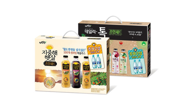 자연은 지중해 햇살 선물세트는 물 한 방울, 설탕 한 톨도 더하지 않고 지중해산 오렌지와 포도만 그대로 짜서 담은 착즙주스 선물세트다. 1L 들이 오렌지 2병과 포도 1병으로 구성되었으며, 가격은 1만 5000원이다.