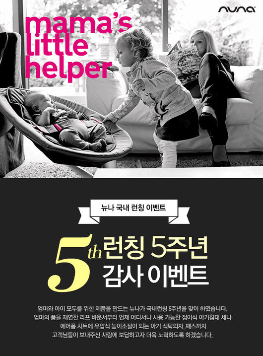네덜란드 프리미엄 육아용품 브랜드 뉴나(NUNA)는 오는 30일까지 국내 론칭 5주년 특별 프로모션을 GS샵 '째즈 식탁의자'와 '리프 바운서' 특별 프로모션을 진행한다고 밝혔다.