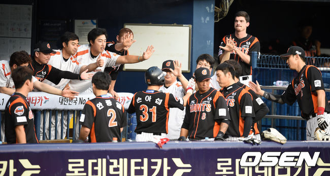 1회초 2사 2루에서 롯데 손아섭이 강민호의 선제 1타점 중전 적시타에 홈을 밟고 동료선수들과 하이파이브를 하고 있다.