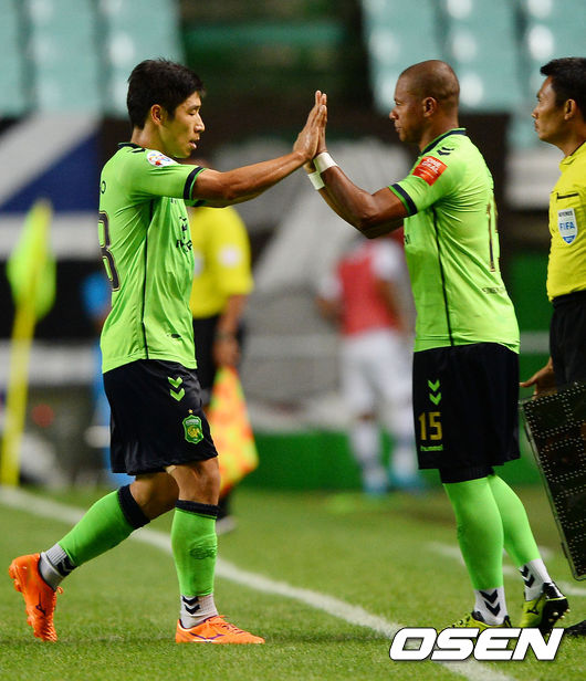 26일 오후 전라북도 전주시 전주월드컵경기장에서 열린 전북 현대와 감바 오사카의 아시아축구연맹(AFC) 챔피언스리그 8가 1차전, 후반 전북 이근호가 루이스와 교체되고 있다.