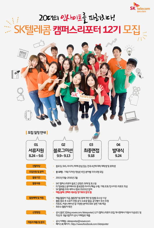 전국 4년제 대학에 재학, 휴학 중인 대학생이라면 누구나 지원 가능하며, SK텔레콤 캠퍼스리포터 공식 블로그(http://www.sktreporter.com)에서 지원 서류를 다운로드 받아 작성한 후 운영사무국 이메일(sktreporter@naver.com)로 접수하면 된다. /letmeout@osen.co.kr