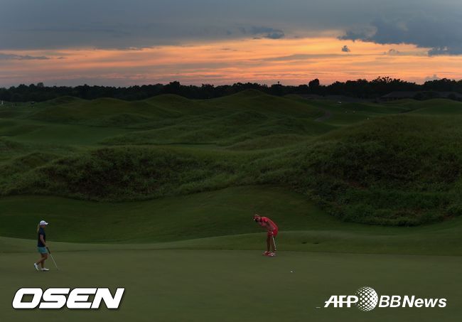 해가 넘어가 어둠이 내린 가운데 렉시 톰슨이 퍼팅하는 모습을 오스틴 언스트가 지켜 보고 있다. 아래 사진은 김세영의 경기 모습. /ⓒAFPBBNews = News1(무단전재 및 재배포 금지)