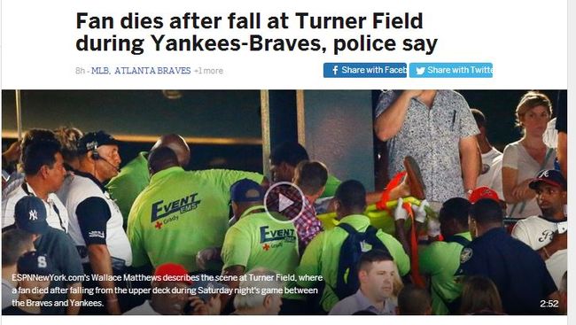 이 매체들에 따르면 이날 터너필드에서 열린 뉴욕 양키스와 애틀랜타의 경기 도중 알렉스 로드리게스(양키스)가 대타로 소개됐을 때 그레고리 머리라는 60대 남성이 추락한 것으로 전해졌다.