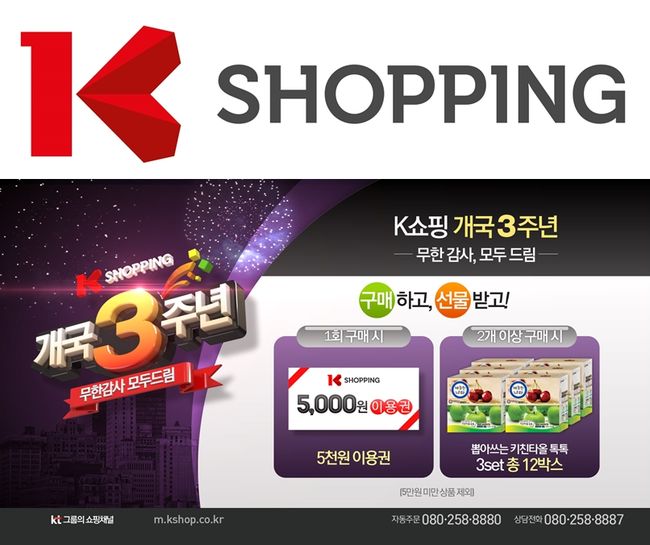 한편 K쇼핑은 개국 3주년을 기념하여 9월 한 달간 구매자 전원에게 K쇼핑 이용권 및 사은품을 증정하며 추석 상품 구매 고객에게 3배 적립금 추첨 이벤트를 실시한다. /letmeout@osen.co.kr