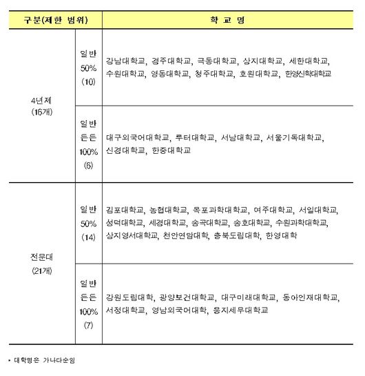 8월 31일 교육부가 발표한 대학 구조개혁 평가 결과에 따르면 A등급이 일반 34개교 전문 14개교, B등급이 일반 56개교 전문 26개교, C등급이 일반 36개교 전문 58개교였다. 또한 D등급은 일반 26개교 전문 27개교, E등급이 일반 6개교 전문 7개교로 집계 됐다.