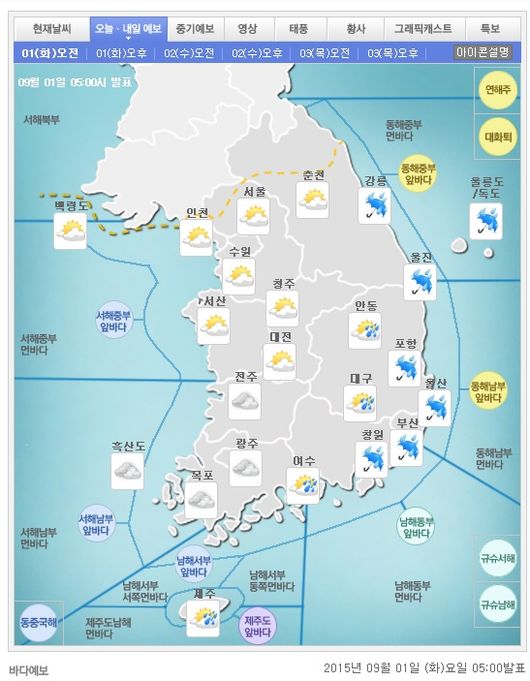 9월 1일 오전 현재, 전국에 구름이 많고, 전남남해안과 경상남도, 동해안은 흐리고 비가 오는 곳이 있다.