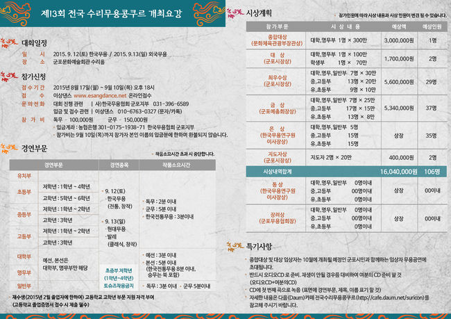 오는 12, 13일 양일간 군포문화예술회관 수리홀에서 열리는 전국수리무용콩쿠르는 2002년 1회 대회부터 올해 13회 대회까지 매 대회마다 평균 140여팀 400여명의 무용인들이 꾸준히 참가하고 있다. 2006년 제4회 콩쿠르부터는 문화체육관광부 장관상을 유치해 한층 격을 높였다.