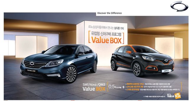 르노삼성자동차는 9월 한달 간 'SM5'와 'QM3'를 구매하는 이에게 르노삼성자동차 전속 캐피탈사인 알씨아이파이낸셜서비스코리아의 0.5% 특별금리 할부 혜택, 해피케어 보증연장 서비스, 신차 교환 보장 프로그램, 스마트 운전자 보험 등 유럽형 신차구매 패키지인 '밸류박스'를 제공한다.