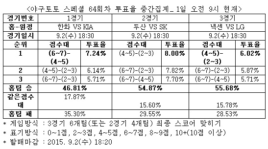 [야구토토] 국민체육진흥공단(www.kspo.or.kr)이 발행하는 체육진흥투표권 스포츠토토(www.sportstoto.co.kr)는 오는 2일에 열리는 2015시즌 한국프로야구(KBO) 3경기를 대상으로 한 야구토토 스페셜 64회차 투표율을 중간 집계한 결과, 참가자들은 2경기 두산-SK전에서 두산의 우세를 예상했다고 밝혔다.