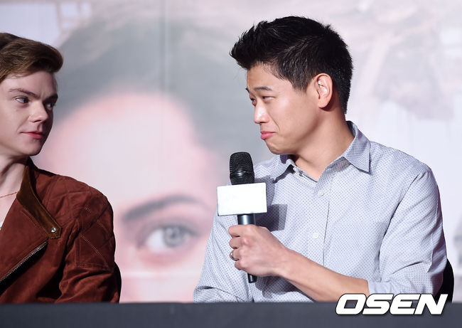 3일 오후 서울 강남구 인터컨티넨털 코엑스 하모니볼룸에서 영화 '메이즈 러너: 스코치 트라이얼'(웨스 볼 감독) 기자회견, 이기홍이 토마스 생스터를 보며 깜찍한 표정을 짓고 있다.