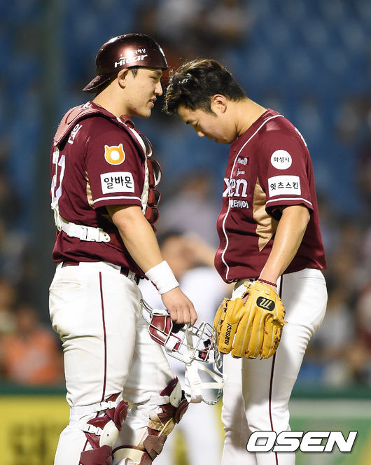 5회말 1사 1루에서 넥센 문성현이 한화 이용규에 좌전 안타를 허용하며 아쉬워하고 있다.