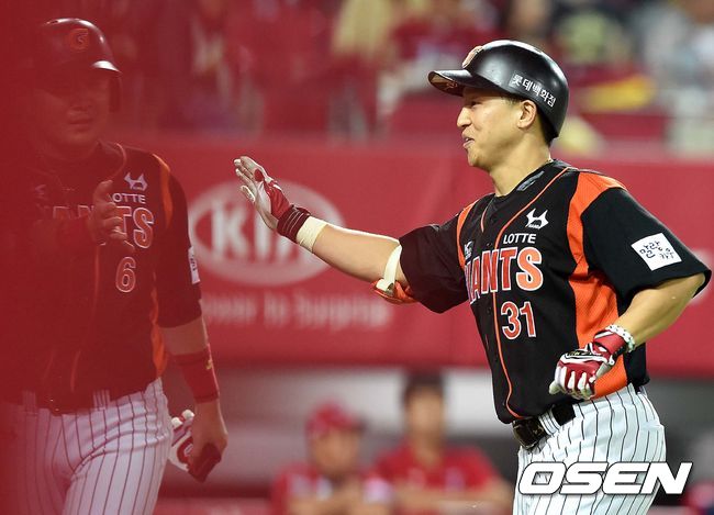 6회초 롯데 공격 1사 3루 상황 손아섭이 달아나는 좌중간 투런포를 날리고 홈을 밟은 뒤 문규현과 인사를 나누고 있다.