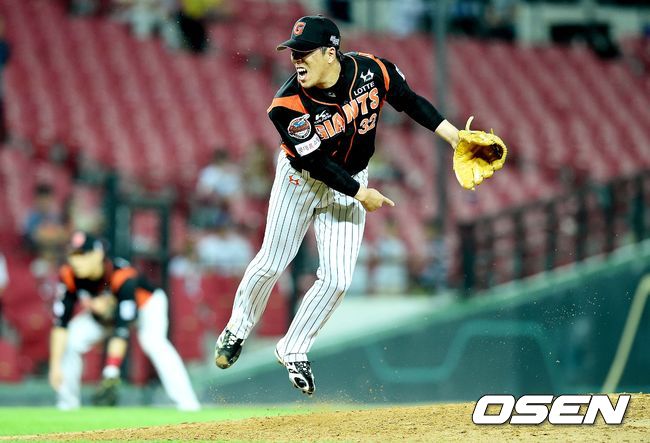 6회말 KIA 공격 때 롯데 투수 김승회가 힘차게 공을 뿌리고 있다.