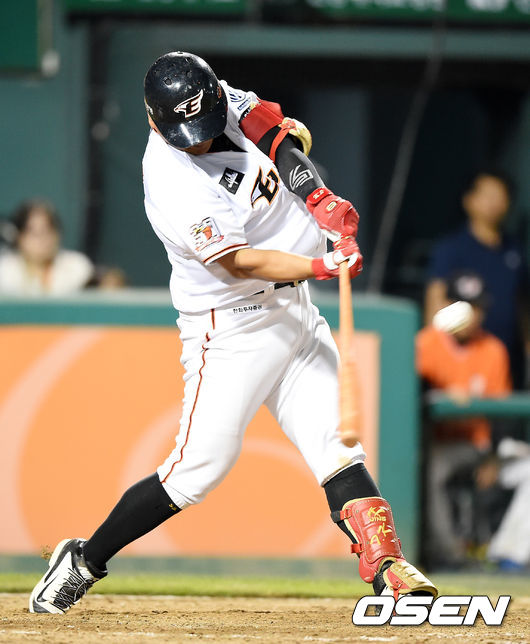 5회말 1사 1,3루에서 한화 김태균이 1타점 적시 2루타를 날리고 있다.