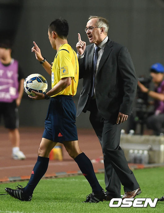3일 오후 경기도 화성종합경기타운 주경기장에 진행된 '2018 러시아월드컵 아시아지역 2차예선' 한국과 라오스의 경기, 전반 종료 후 슈틸리케 감독이 주심에게 강하게 어필을 하고 있다.