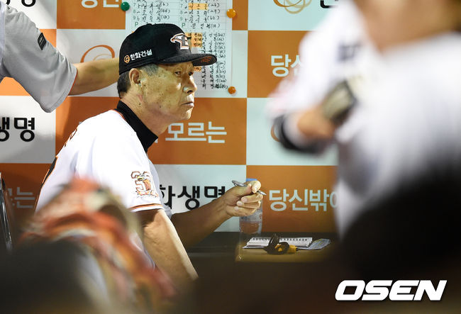6회초 수비를 마치고 한화 김성근 감독이 메모를 하고 있다.