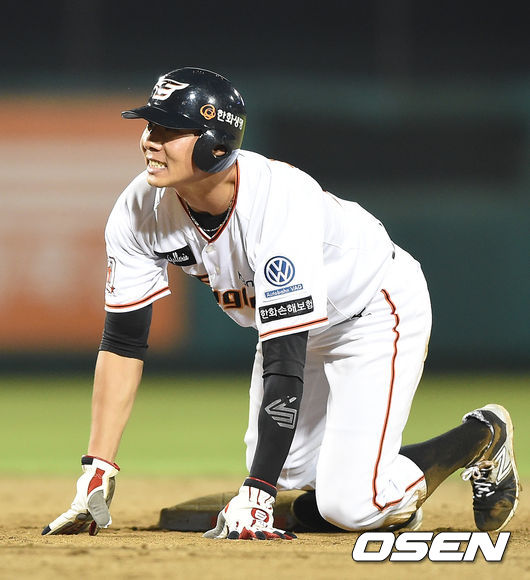 8회말 무사 1루에서 한화 정근우가 보내기 번트를 시도했지만 파울 플라이로 아웃됐다. 권용관이 넥센 박동원의 불안정한 포구에 2루로 내달렸지만 김하성에 태그아웃당하며 아쉬워하고 있다.