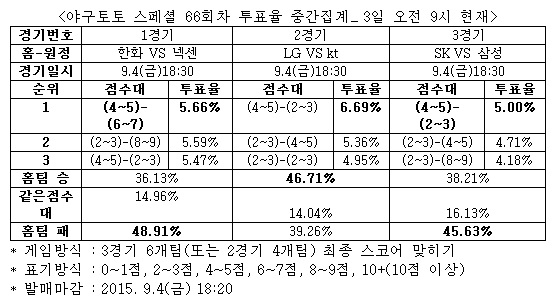 [야구토토] 국민체육진흥공단(www.kspo.or.kr)이 발행하는 체육진흥투표권 스포츠토토(www.sportstoto.co.kr)는 4일에 열리는 2015시즌 한국프로야구(KBO) 3경기를 대상으로 한 야구토토 스페셜 66회차 투표율을 중간 집계한 결과, 참가자들은 3경기 삼성-SK전에서 삼성의 우세를 예상했다고 밝혔다.