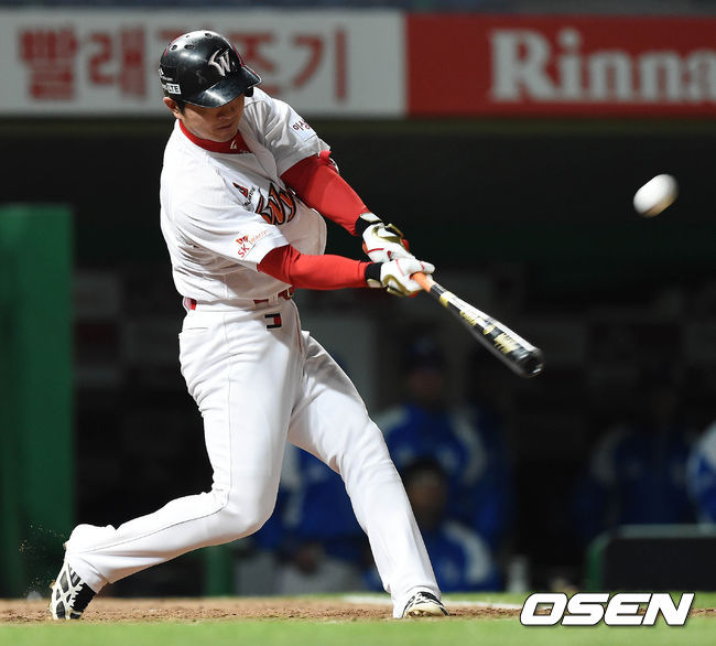 이명기가 안타로 출루한 상황에서 SK는 김성현에게 희생번트를 지시했으나 두 차례 시도가 모두 파울이 됐다. 그러나 김성현은 보란 듯이 좌월 2점 홈런을 쳐내며 SK에 단번에 2점을 선사했다. /skullboy@osen.co.kr