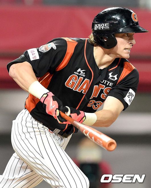 5회초 롯데 공격 2사 3루 상황 아두치가 적시 1타점 좌전안타를 날리고 있다.