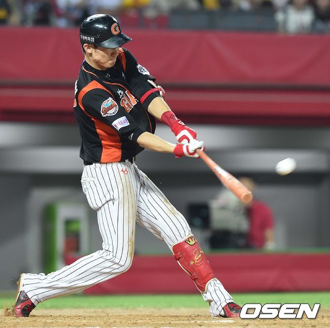 5회초 롯데 공격 2사 1, 2루 상황 오승택이 좌측 펜스를 맞히는 1타점 2루타를 날리고 있다.