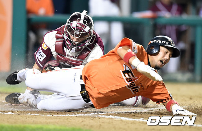 6회말 2사 1루에서 한화 이용규가 김경언의 안타에 홈까지 내달렸지만 넥센 박동원에 태그아웃 당하고 있다.