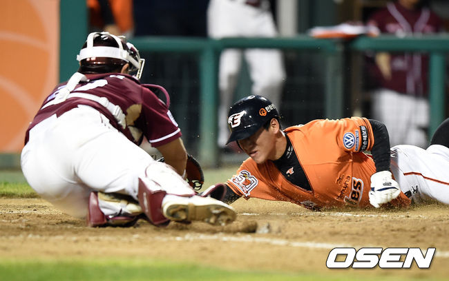 9회말 2사 1루에서 한화 송주호가 폭스의 2루타에 홈으로 내달렸지만 넥센 박동원에 태그아웃 당하고 있다./ jpnews@osen.co.kr