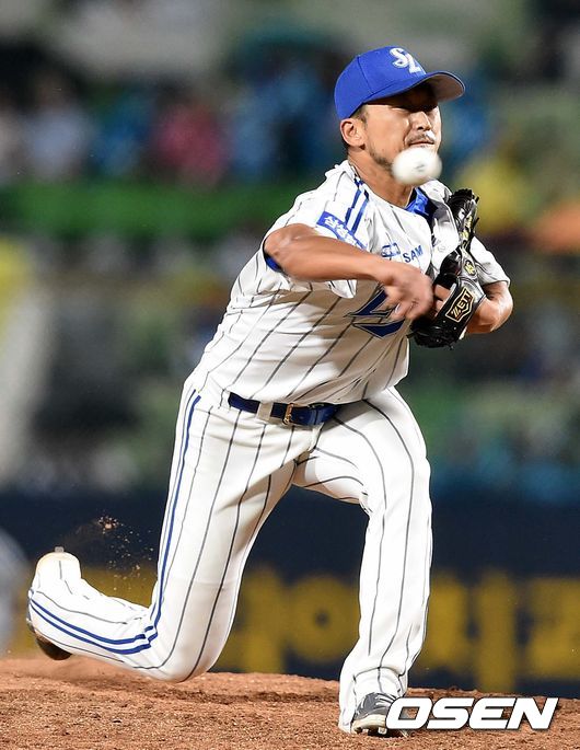 9회초 KIA 공격 2사 1루 상황에서 마운드에 오른 삼성 투수 권오준이 힘차게 공을 뿌리고 있다.
