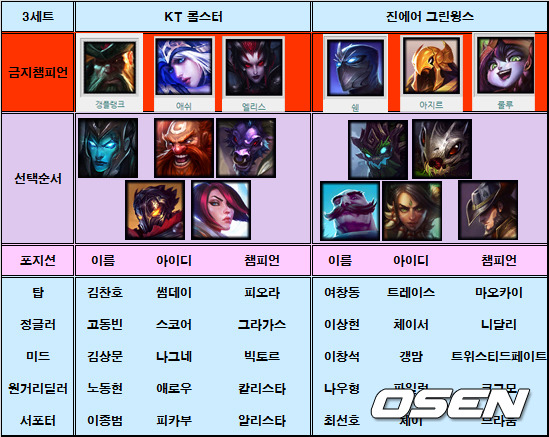 반면 KT는 믿었던 '썸데이' 김찬호의 피오라가 계속 팀의 흐름을 끊었다. 2세트 승리의 주역이었던 김찬호는 3세트에서는 5데스로 무너졌다. 승기를 내줬다고 판단한 KT는 31분 항복을 선언하고 말았다. / scrapper@osen.co.kr