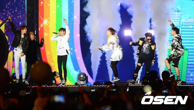 5일 오후 서울 마포구 상암MBC 앞 상암문화광장에서 열린 K-ICT와 함께하는 K-POP 슈퍼콘서트(DMC 페스티벌 슈퍼콘서트, 케이팝 슈퍼콘서트)서 비스트가 화려한 무대를 선보이고 있다.