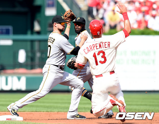1회말 1사 1루 피츠버그 머서가 헤이워드의 2루수 앞 땅볼 때 해리슨의 강한 글러브 토스를 받아 1루주자 카펜터를 아웃시키고 있다. / youngrae@osen.co.kr